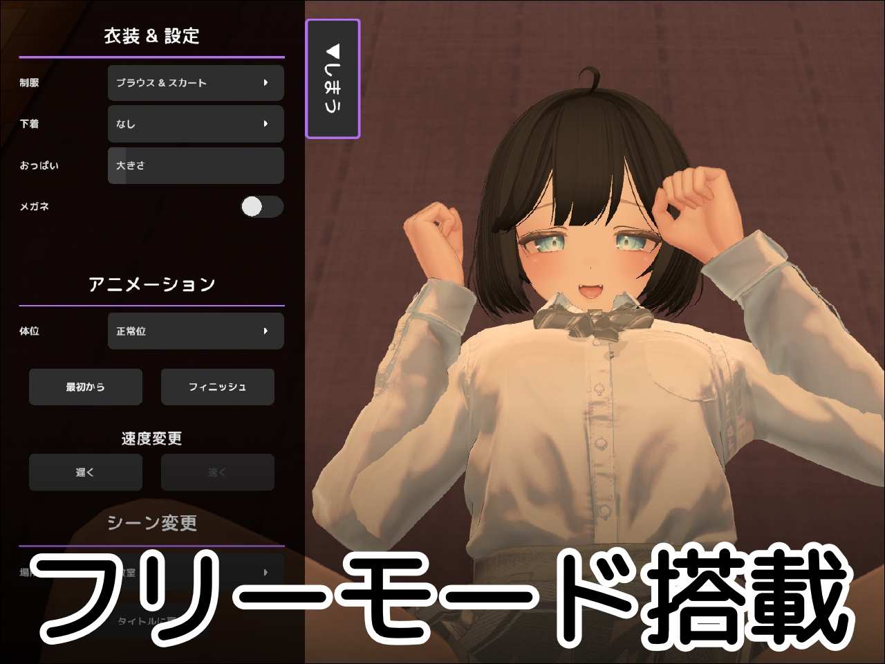 ピストン速度やフィニッシュを操作し、WASD+QEで視点を自由に動かして自分だけのベストアングルを見つけよう!